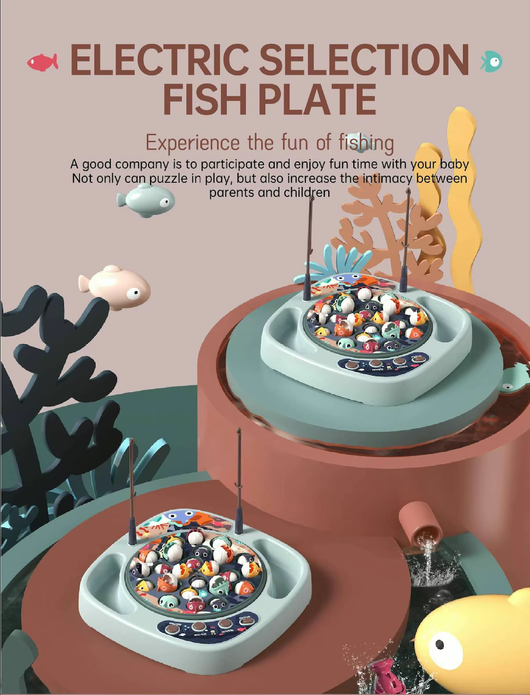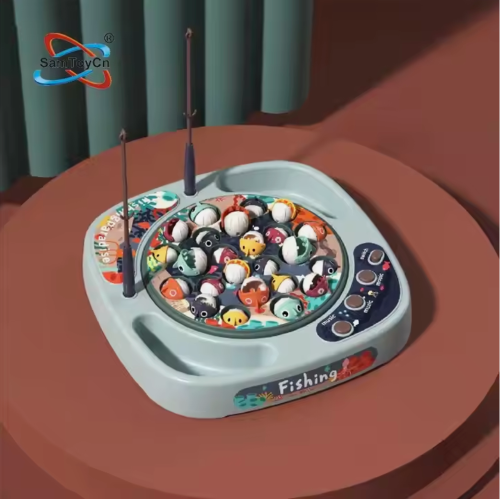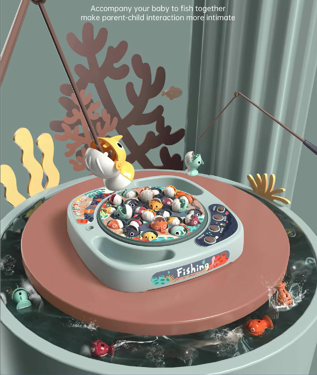 Les petits poissons ouvrent et ferment la bouche et chaque joueur doit pouvoir attraper un plus grand nombre de poissons à l'aide de sa canne à pêche magnétique.